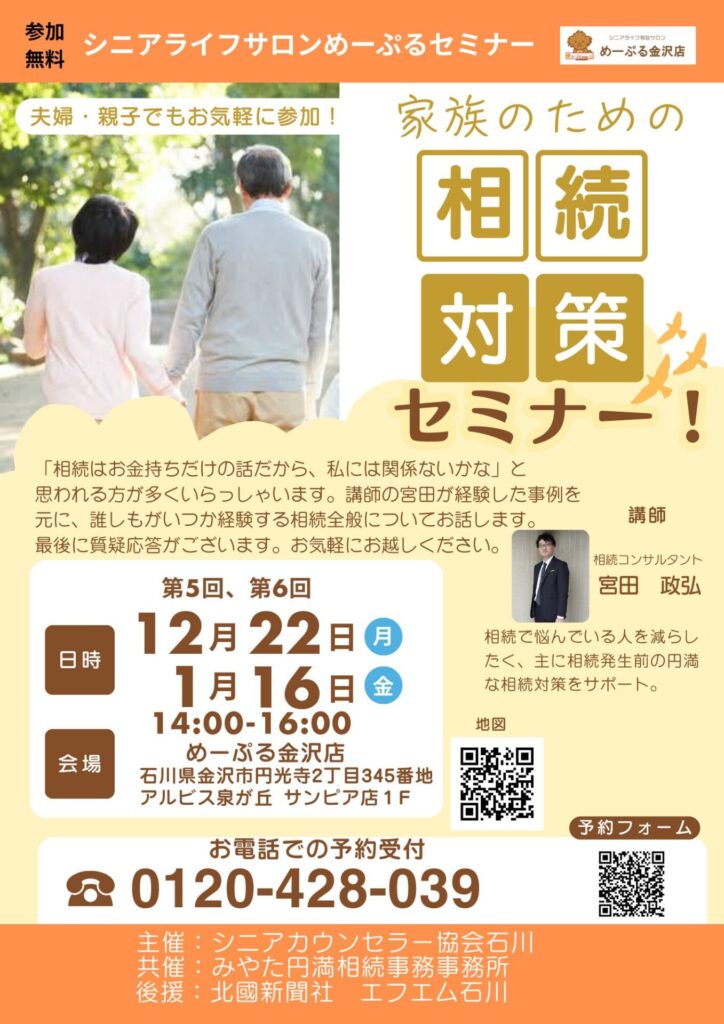 セミナーのご案内です! 1/16(金)14時から、金沢市で相続セミナーを開催します!すでに予約が入ってますが、まだ席があります!アルビスのテナントの、めーぷる金沢店で開催するので、お買い物ついでにでもお越し下さい。この時期は雪の影響もありますが、今の所大雪はなさそうです。お越しの際にはお気をつけて。