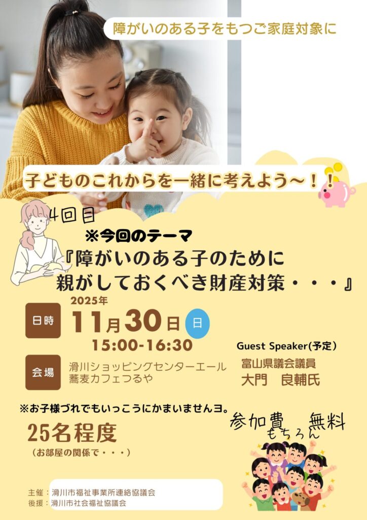 いつもお世話になっている、滑川市のショッピングセンターエール内の「つるや」様で、私が前半に講師させていただくイベントです。「親なきあと」というワードが最近よく耳にします。特に「障がいのある子」を持つ親にとって、自分に何かあってもお子様がお金の面で