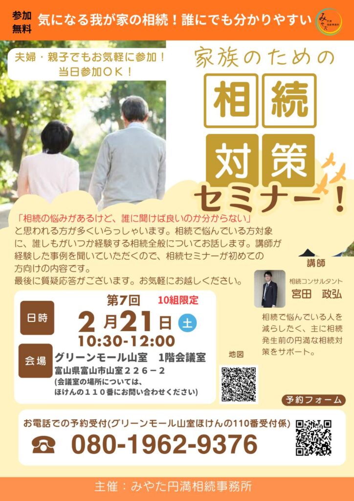 2月セミナー開催のお知らせ 2月はグリーンモールで相続セミナーを開催します!相続においての対策全般のことを話します。最近色んな方から「グリーンモールでの宮田さんのセミナー広告見たよ!」と言って下さります。シャイな私からすると、ありがたく思います。お買い物ついでに寄れるくらい、敷居が低〜いセミナーです!ぜひお越し下さい。 お問い合わせ:080-1962-9376(グリーンモール山室ほけんの110番受付係)